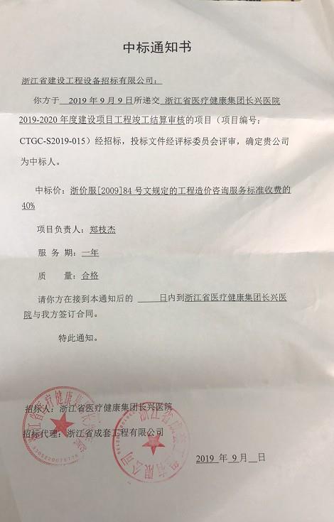 恭喜我司于2019年9月被選定為浙江省醫(yī)療健康集團(tuán)長(zhǎng)興醫(yī)院2019-2020年度建設(shè)工程結(jié)算審核項(xiàng)目的中標(biāo)人!